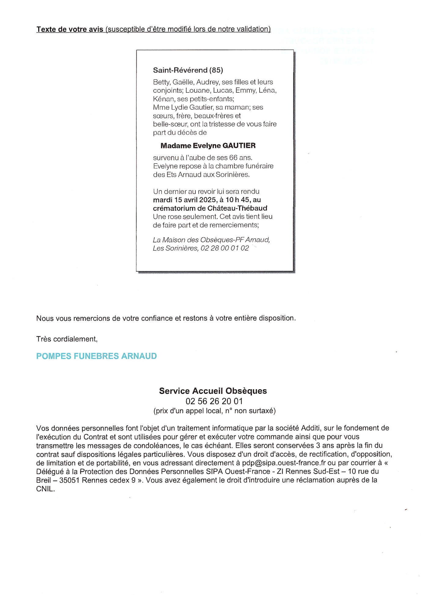 Cet espace « condoléances » est dédié à la mémoire de Madame Evelyne GAUTIER.