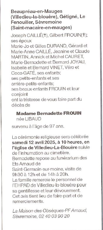 Décédée à Villedieu la Blouère (49450) le mercredi 9 avril 2025