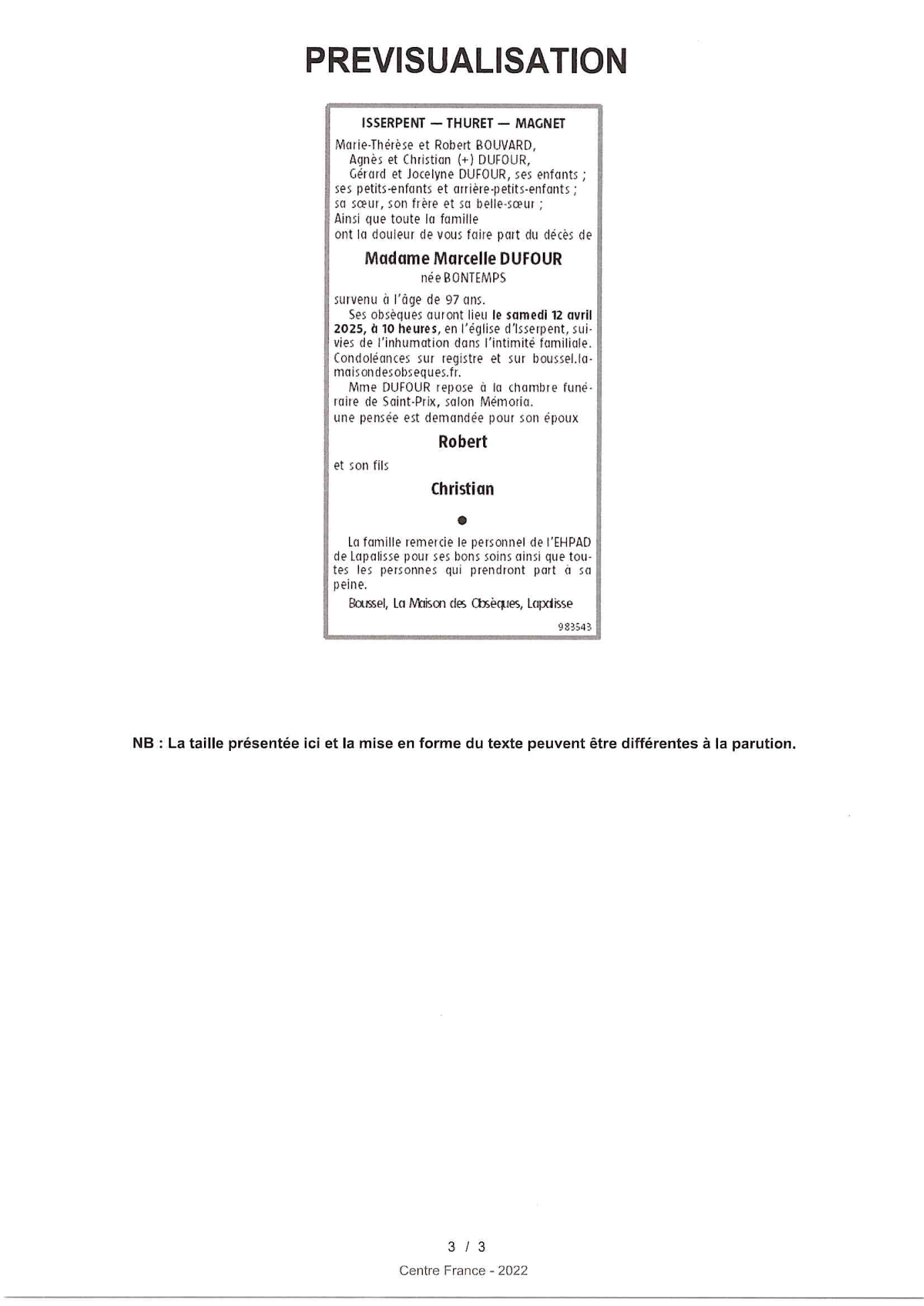 Cet espace « condoléances » est dédié à la mémoire de Madame Marcelle DUFOUR née BONTEMPS.