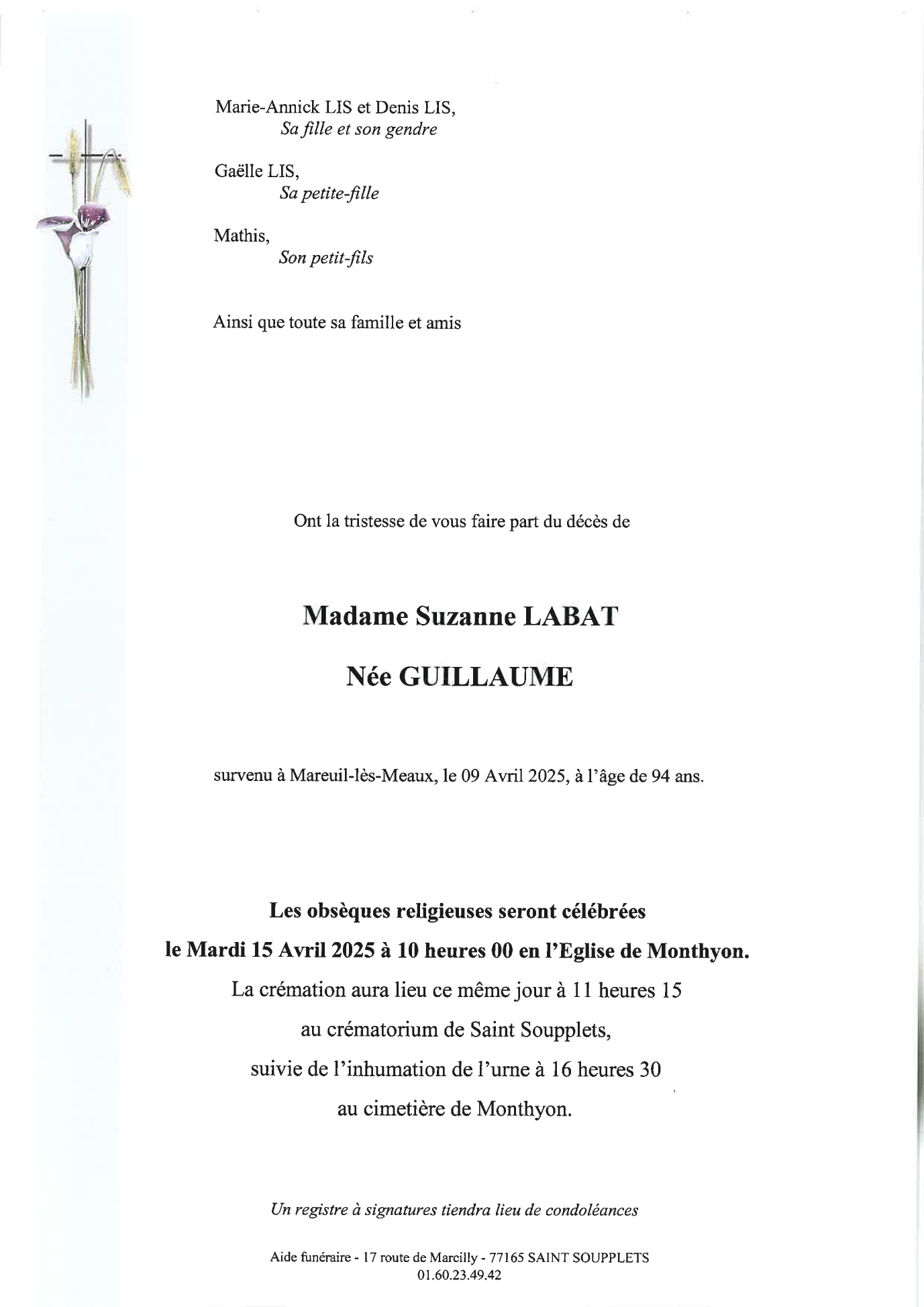 Décédée à Mareuil-lès-Meaux (77100) le mercredi 9 avril 2025