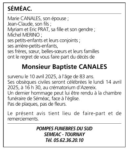Cet espace « condoléances » est dédié à la mémoire de Monsieur Baptiste CANALES.