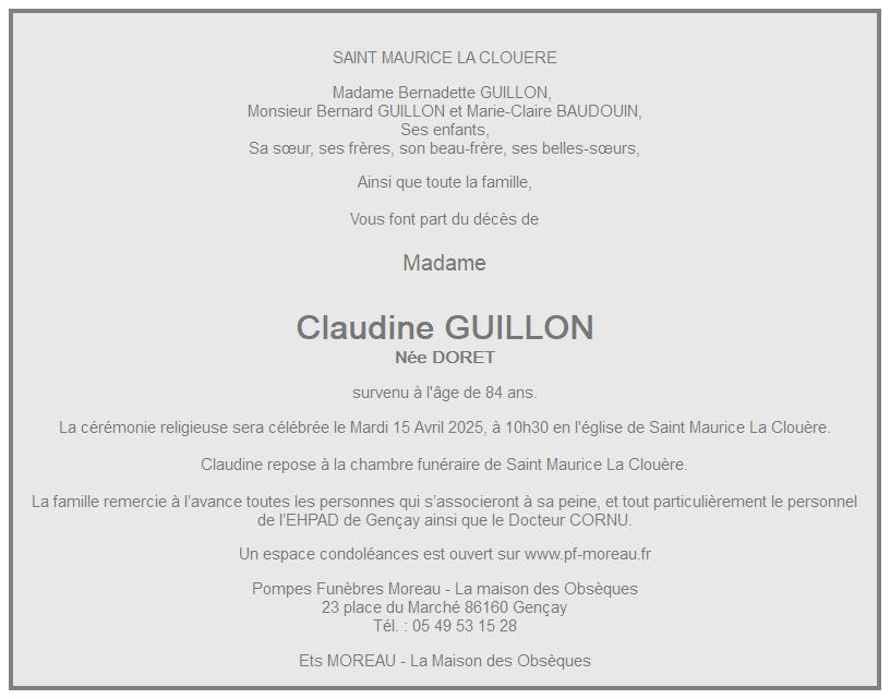 Cet espace « condoléances » est dédié à la mémoire de Madame Claudine GUILLON née DORET.