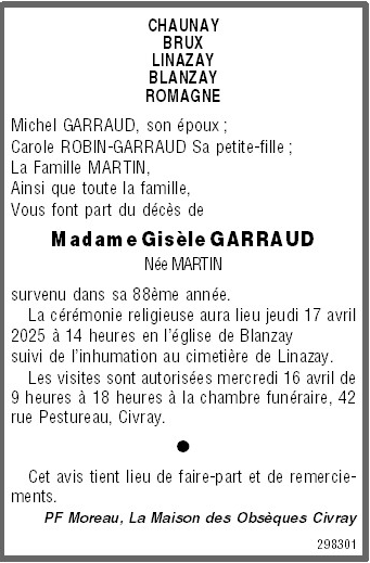 Cet espace « condoléances » est dédié à la mémoire de Madame Gisèle GARRAUD née MARTIN.