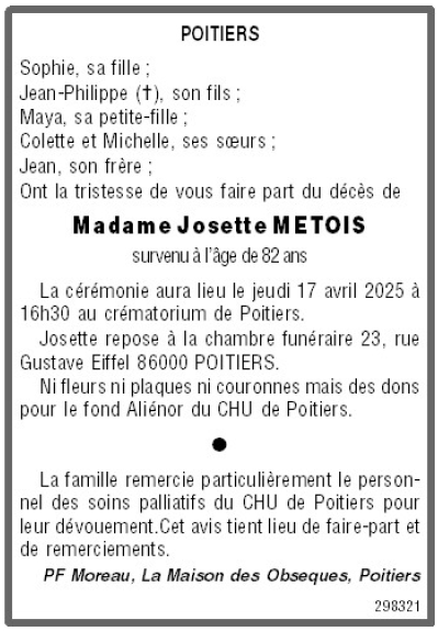 Cet espace « condoléances » est dédié à la mémoire de Madame Josette METOIS.