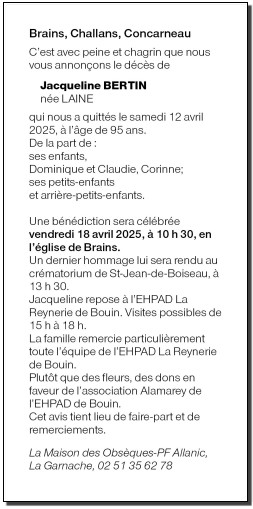 Cet espace « condoléances » est dédié à la mémoire de Madame Jacqueline BERTIN née LAINE.