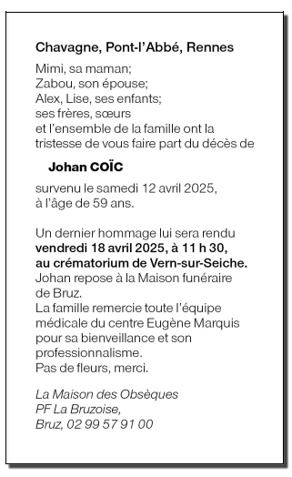 Décédé à Chavagne (35310) le samedi 12 avril 2025