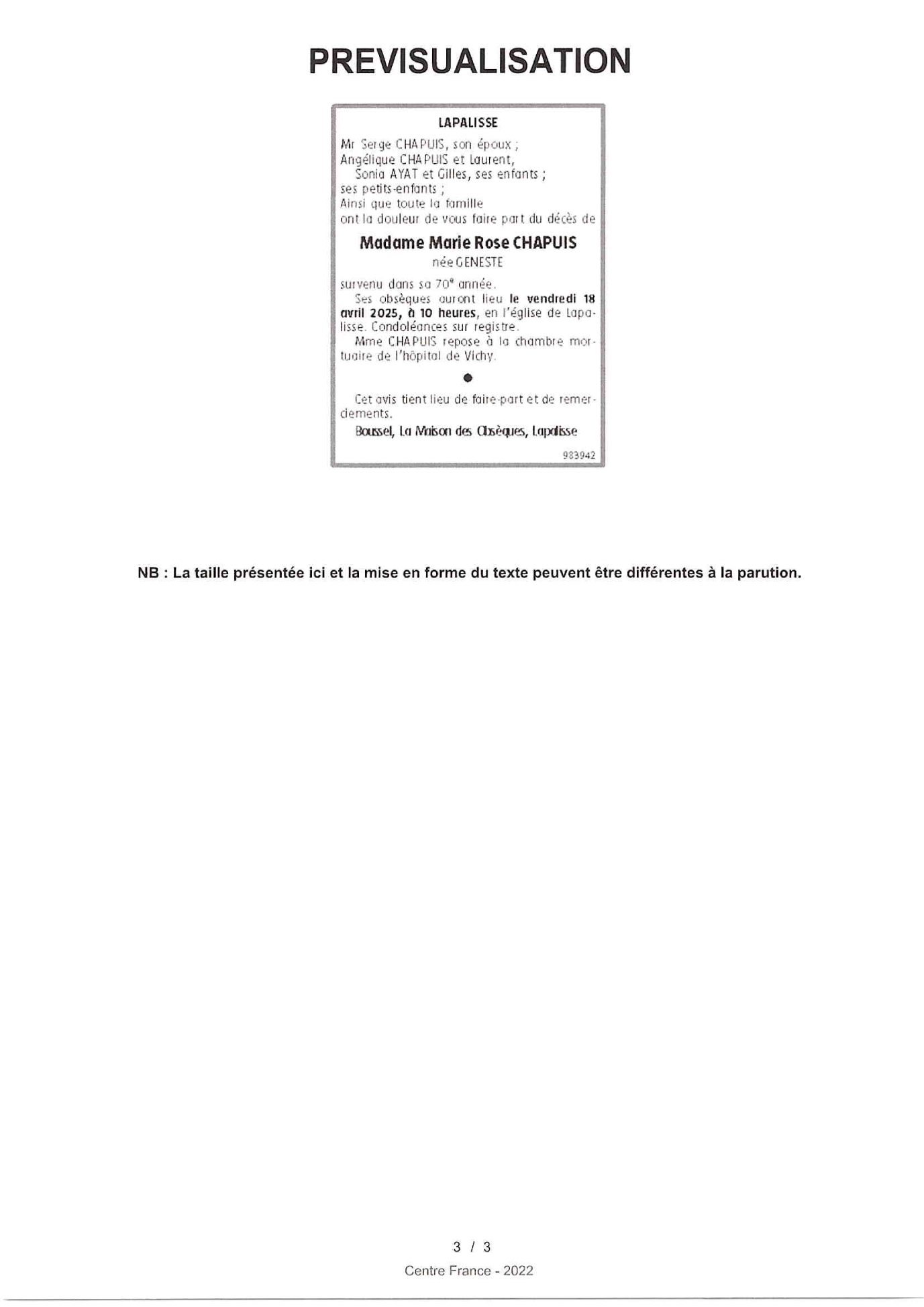 Cet espace « condoléances » est dédié à la mémoire de Madame Marie CHAPUIS née GENESTE.