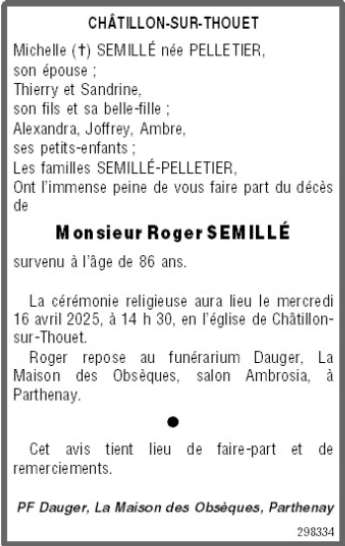 Cet espace « condoléances » est dédié à la mémoire de Monsieur Roger SEMILLÉ.