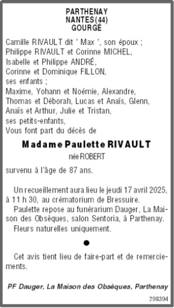Cet espace « condoléances » est dédié à la mémoire de Madame Paulette RIVAULT née ROBERT.