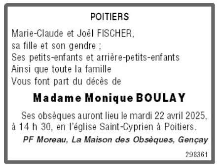 Décédée à Poitiers (86000) le dimanche 13 avril 2025
