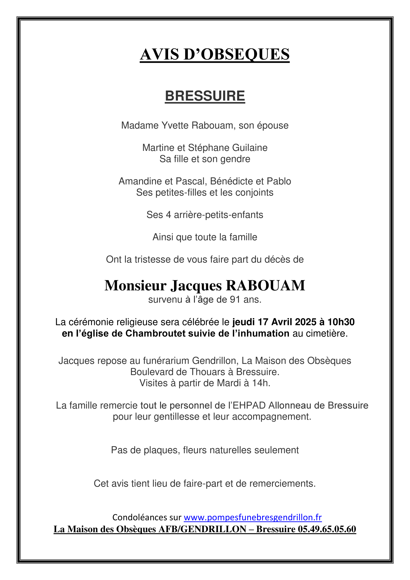 Cet espace « condoléances » est dédié à la mémoire de Monsieur Jacques RABOUAM.