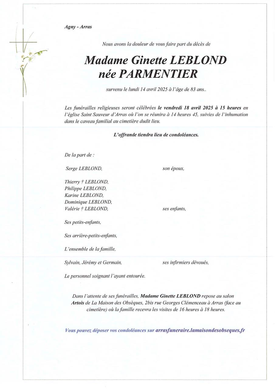 Cet espace « condoléances » est dédié à la mémoire de Madame Ginette LEBLOND née PARMENTIER.