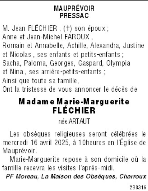 Cet espace « condoléances » est dédié à la mémoire de Madame Marie-Marguerite FLÉCHIER née ARTAUT.