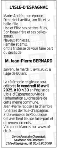 Cet espace « condoléances » est dédié à la mémoire de Monsieur Jean-Pierre BERNARD.