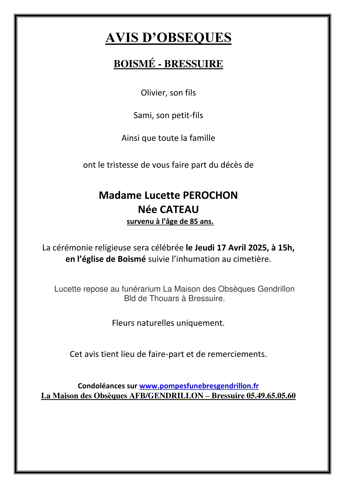 de Madame Lucette PEROCHON née CATEAU