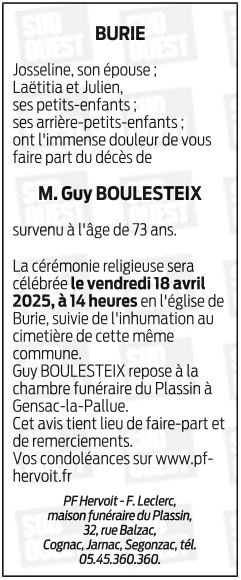 Cet espace « condoléances » est dédié à la mémoire de Monsieur Guy BOULESTEIX.