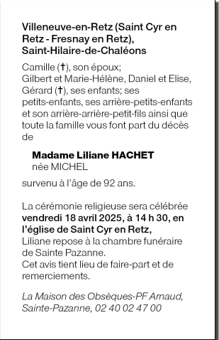 Cet espace « condoléances » est dédié à la mémoire de Madame Liliane HACHET née MICHEL.