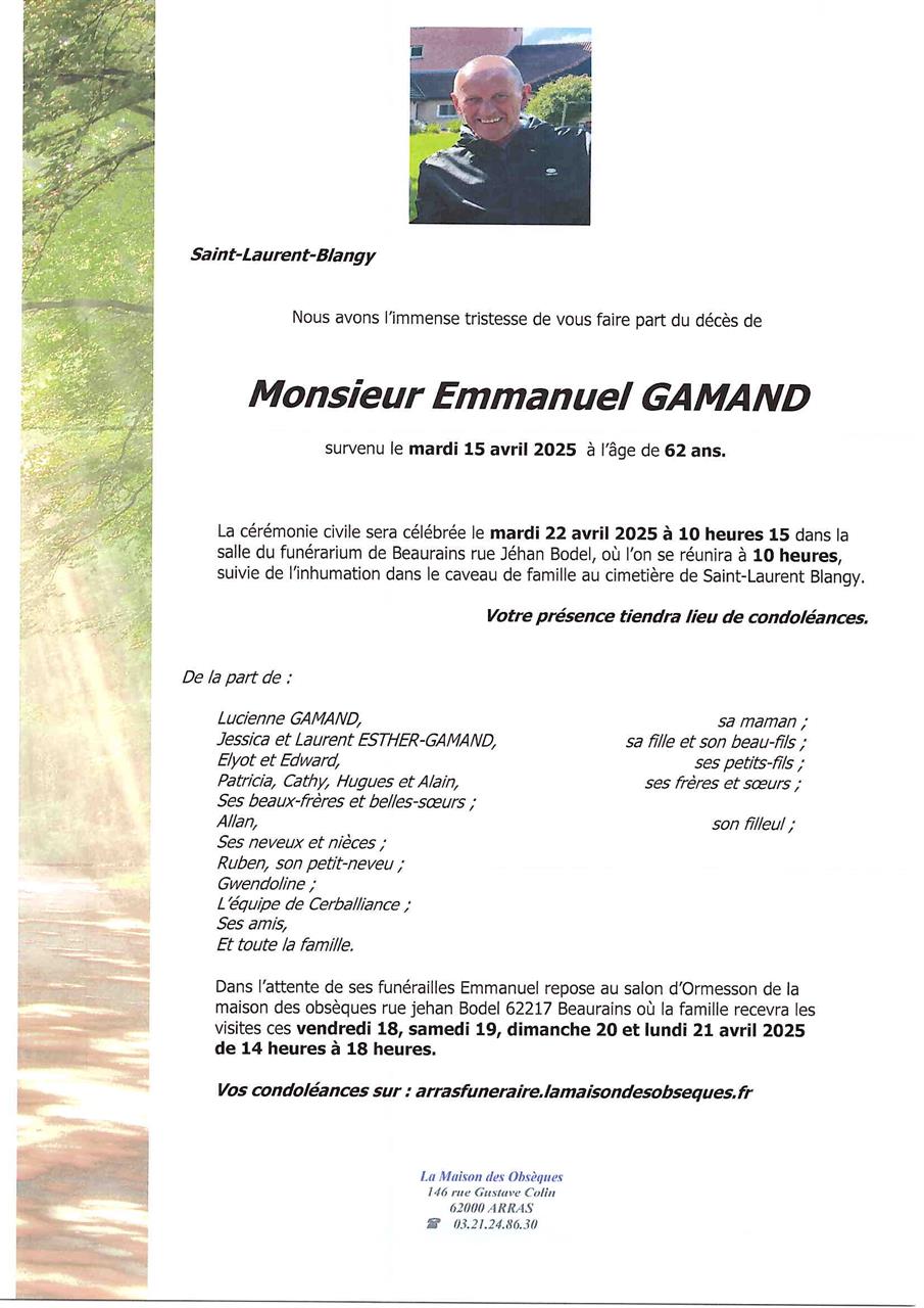 Cet espace « condoléances » est dédié à la mémoire de Monsieur Emmanuel GAMAND.
