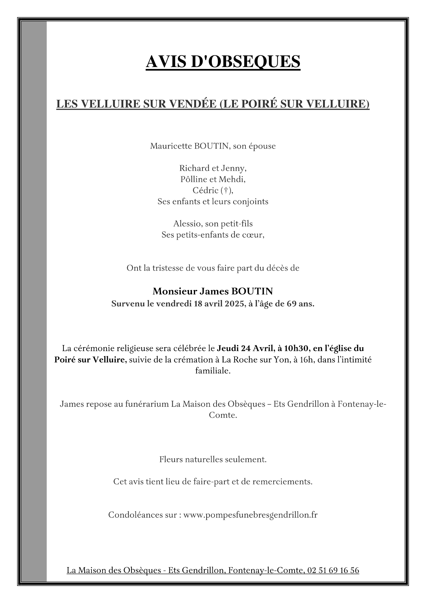 Cet espace « condoléances » est dédié à la mémoire de Monsieur James BOUTIN.