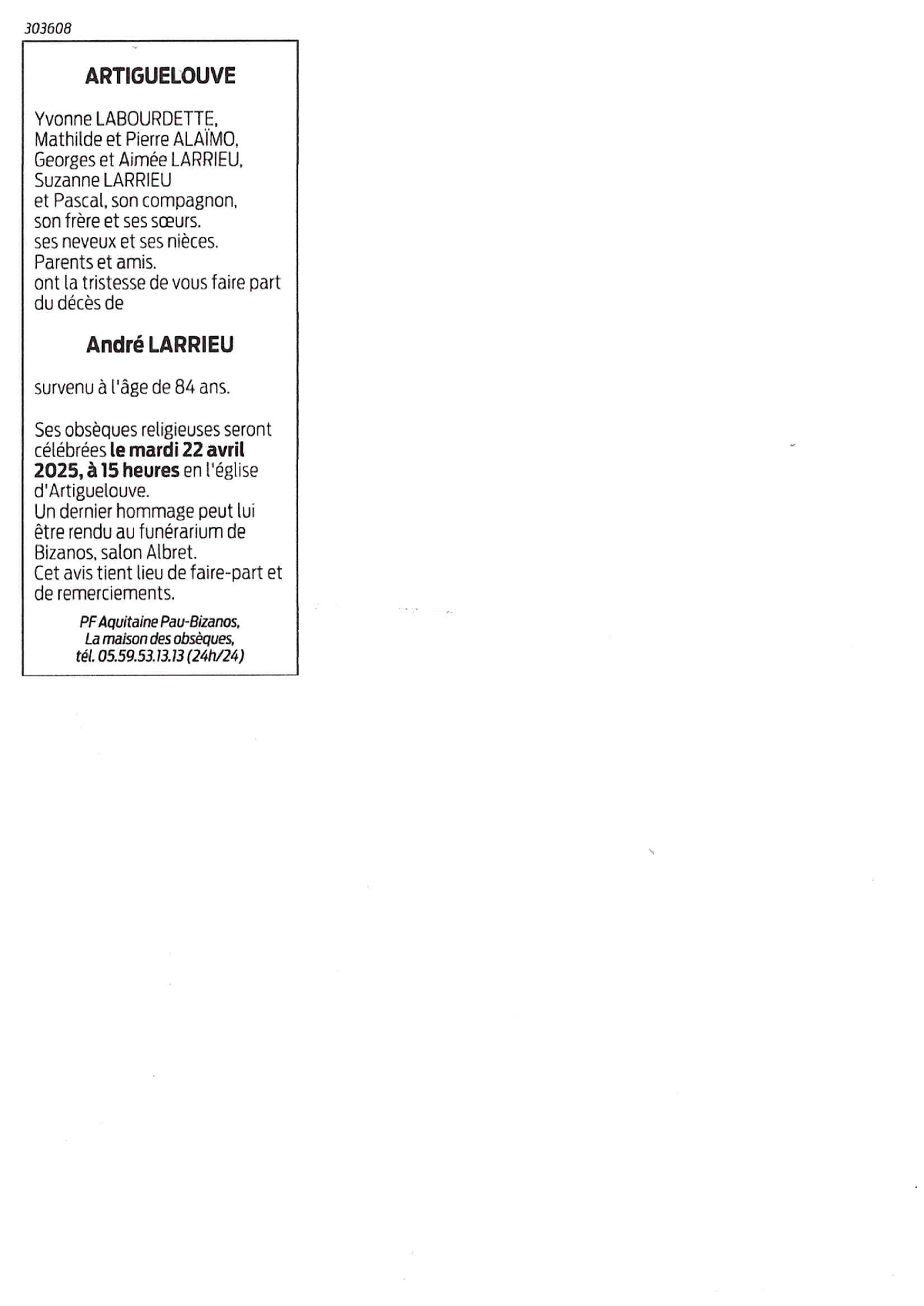 Décédé à Artiguelouve (64230) le mardi 15 avril 2025