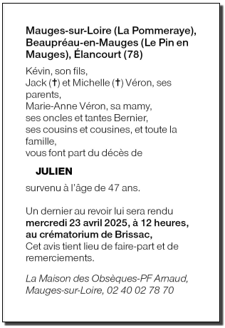 Décédé à La Pommeraye (49620) le mardi 15 avril 2025