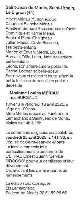 Cet espace « condoléances » est dédié à la mémoire de Madame Louisa MERIAU née BURGAUD.