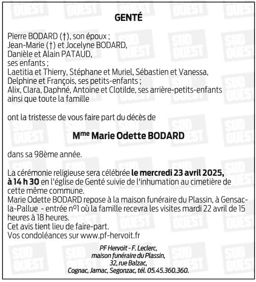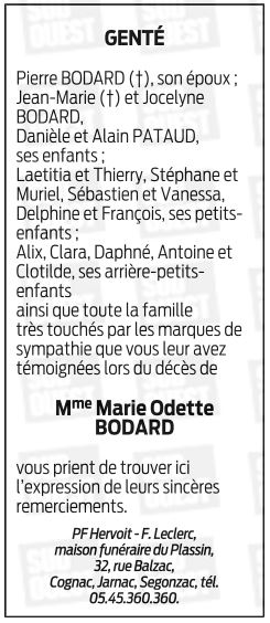 Cet espace « condoléances » est dédié à la mémoire de Madame Marie BODARD née OLLIER.