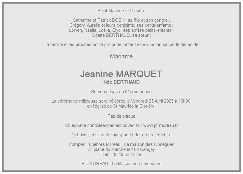 Cet espace « condoléances » est dédié à la mémoire de Madame Jeanine MARQUET née BERTHAUD.