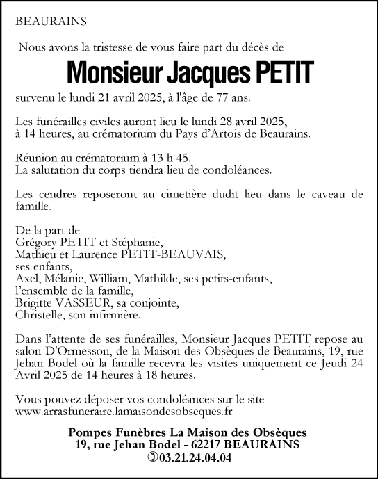 Cet espace « condoléances » est dédié à la mémoire de Monsieur Jacques PETIT.