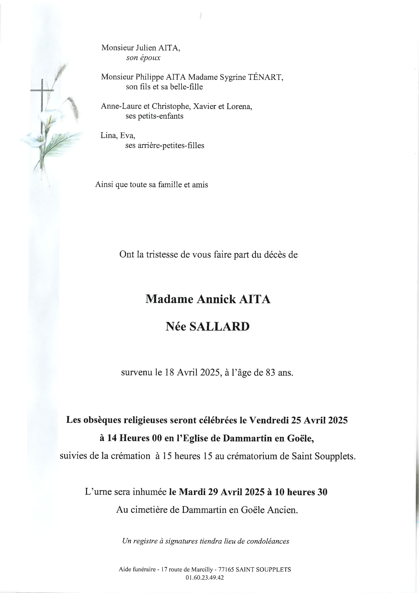 de Madame Annick AITA née SALLARD