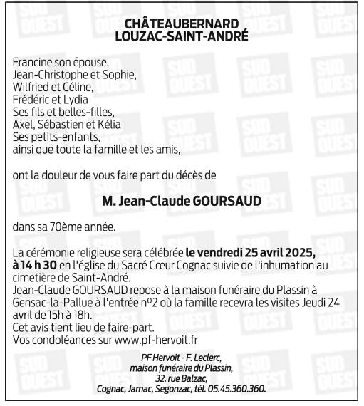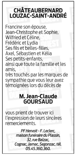 Cet espace « condoléances » est dédié à la mémoire de Monsieur Jean-Claude GOURSAUD.
