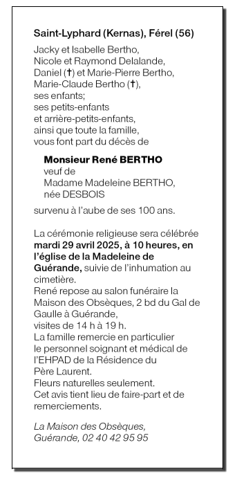 Cet espace « condoléances » est dédié à la mémoire de Monsieur René BERTHO.