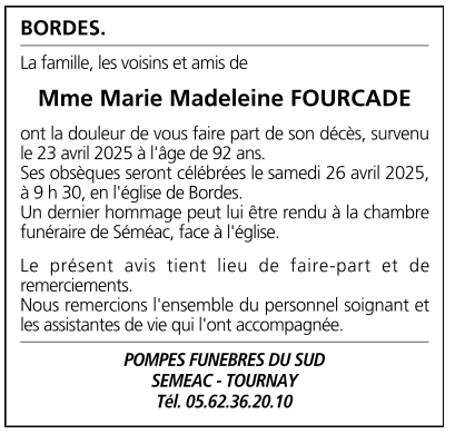 Cet espace « condoléances » est dédié à la mémoire de Madame Marie FOURCADE.