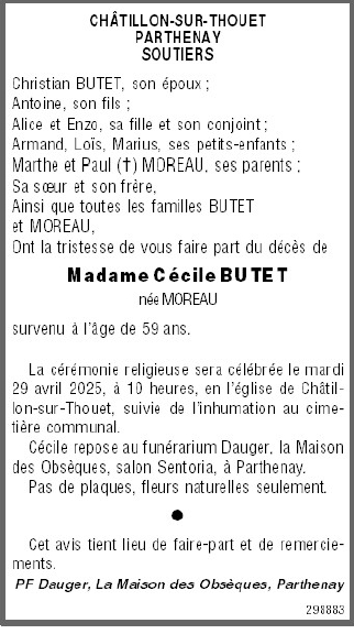 Cet espace « condoléances » est dédié à la mémoire de Madame Cécile BUTET née MOREAU.