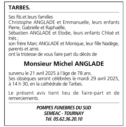 Cet espace « condoléances » est dédié à la mémoire de Monsieur Michel ANGLADE.