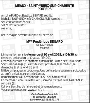 Cet espace « condoléances » est dédié à la mémoire de Madame FRÉDÉRIQUE BEIJARD née TAUPIGNON.