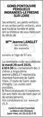 Cet espace « condoléances » est dédié à la mémoire de Madame Jeanne LANGLET née DAURIEL.