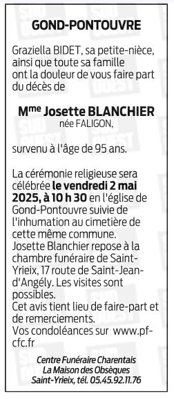 Décédée à Le Gond Pontouvre (16160) le jeudi 24 avril 2025