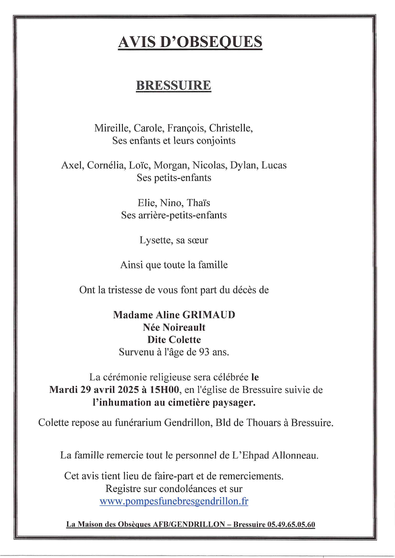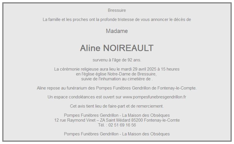 Cet espace « condoléances » est dédié à la mémoire de Madame Aline GRIMAUD née NOIREAULT.