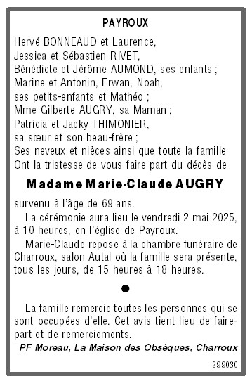 Cet espace « condoléances » est dédié à la mémoire de Madame Marie-Claude AUGRY.