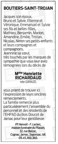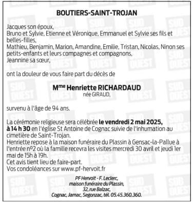Cet espace « condoléances » est dédié à la mémoire de Madame Henriette RICHARDAUD née GIRAUD.
