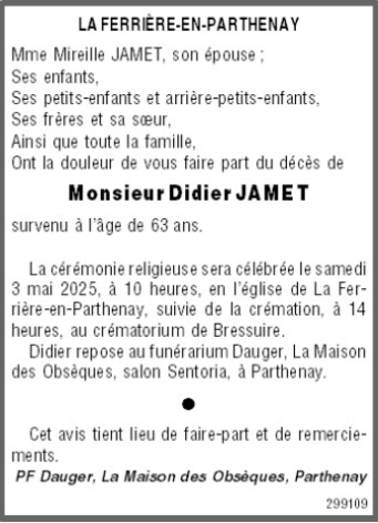 Cet espace « condoléances » est dédié à la mémoire de Monsieur Didier JAMET.