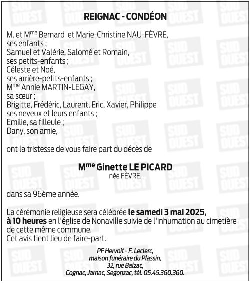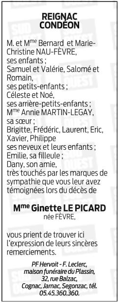 Cet espace « condoléances » est dédié à la mémoire de Madame Marie, Arlette, Ginette LE PICARD née FÈVRE.