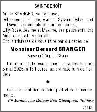 Cet espace « condoléances » est dédié à la mémoire de Monsieur Bernard BRANGER.