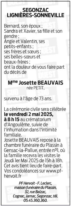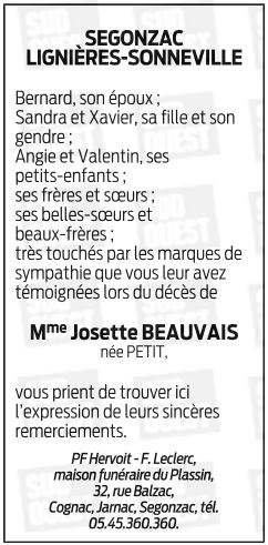 de Madame Josette BEAUVAIS née PETIT