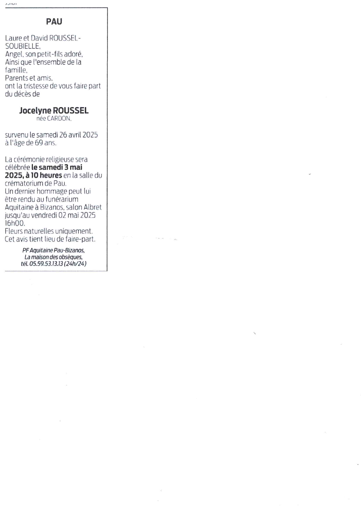 Décédée à Pau (64000) le samedi 26 avril 2025