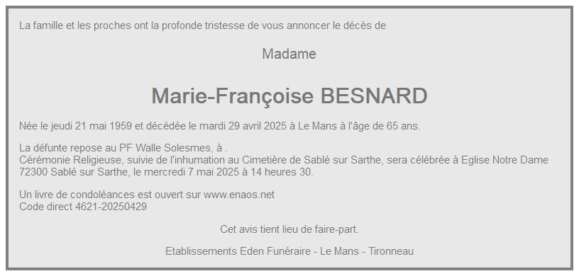 Cet espace « condoléances » est dédié à la mémoire de Madame Marie-Françoise BESNARD.