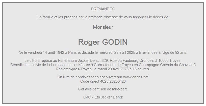 Cet espace « condoléances » est dédié à la mémoire de Monsieur Roger GODIN.