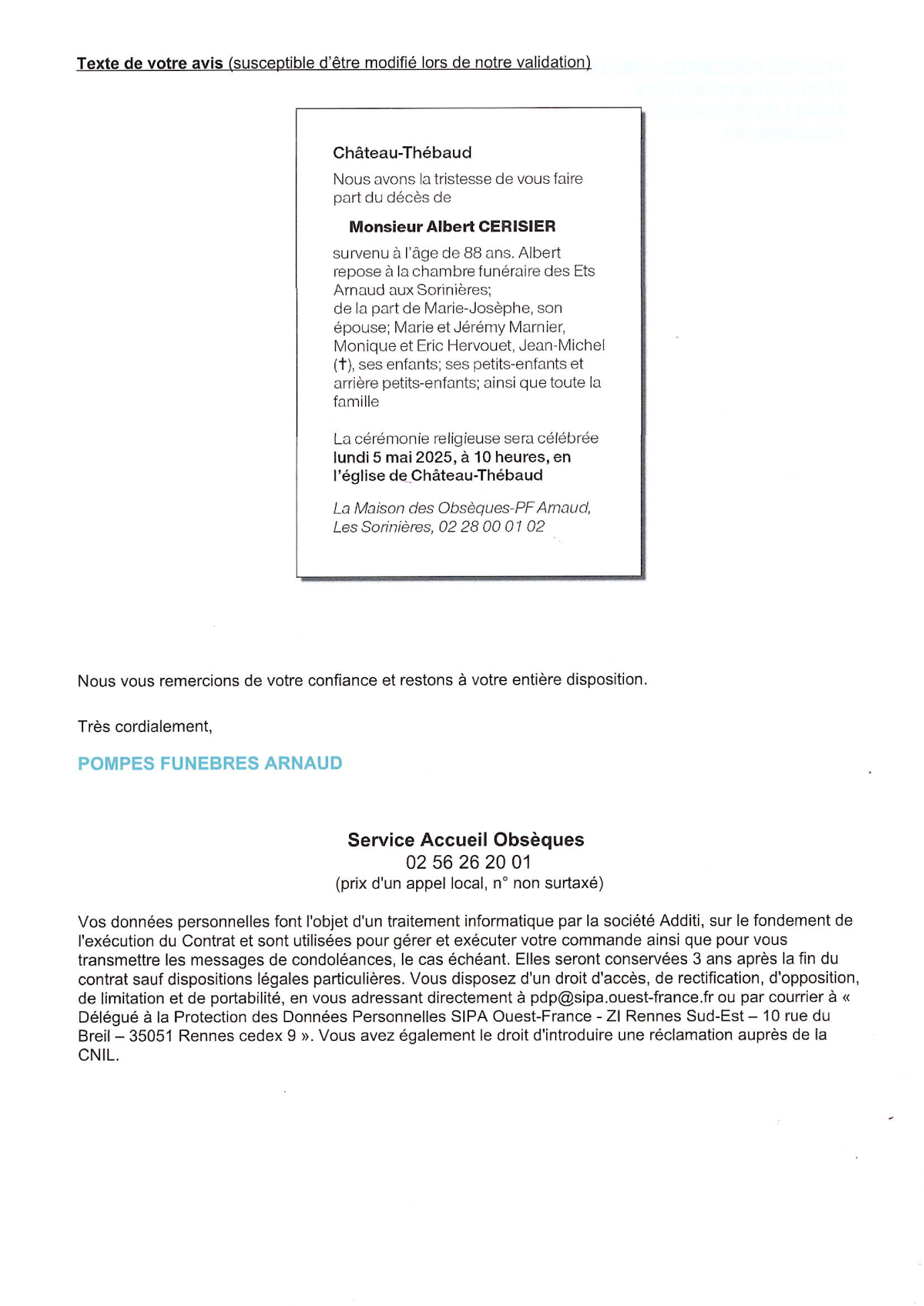 Cet espace « condoléances » est dédié à la mémoire de Monsieur Albert CERISIER.