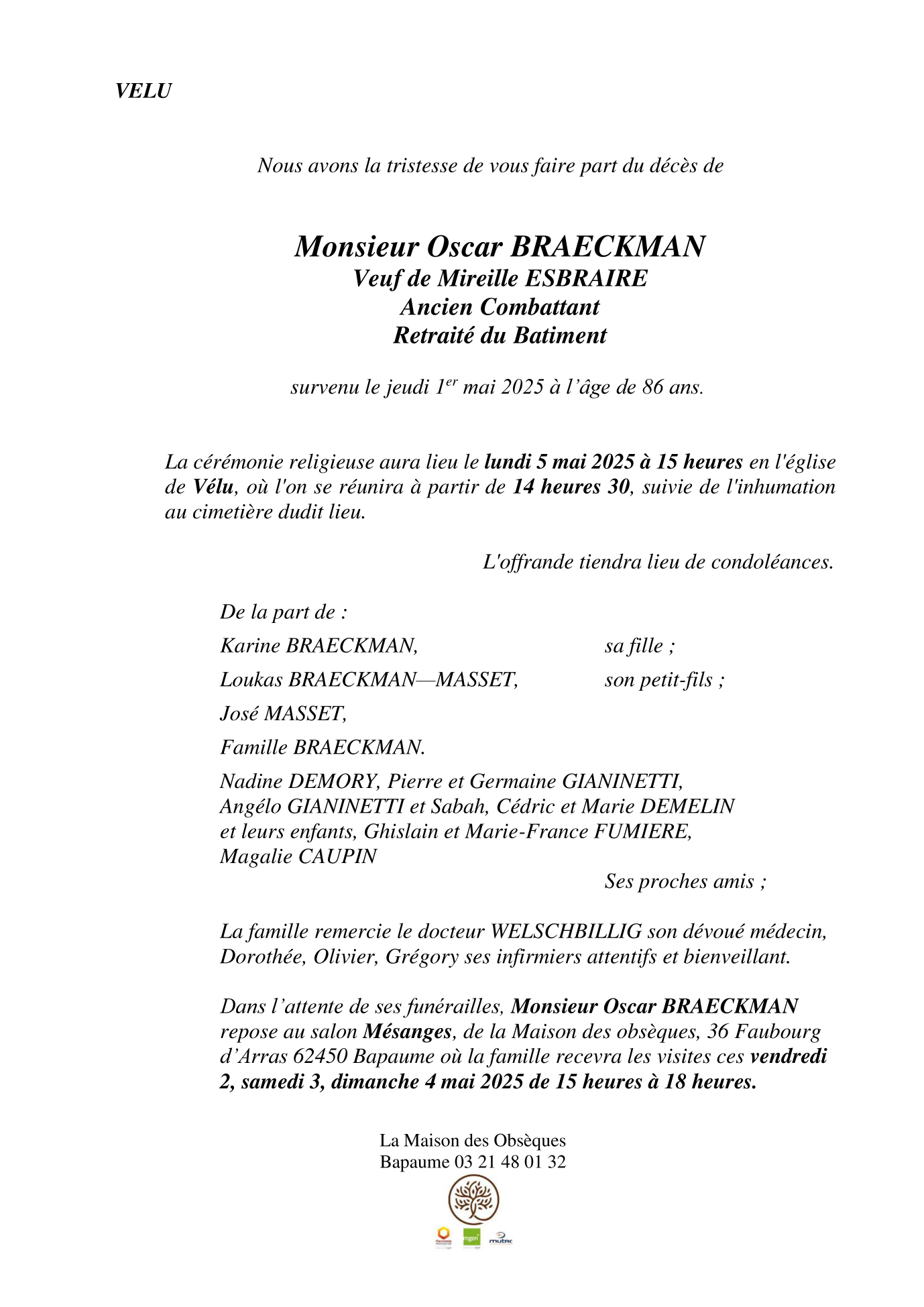Cet espace « condoléances » est dédié à la mémoire de Monsieur Oscar BRAECKMAN.
